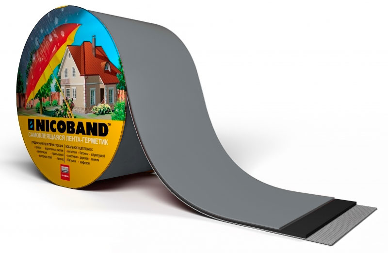 Герметизирующая лента Никобaнд (NICOBAND) получают путем одностороннего нанесения на фольгированною УФ — стойкую пленку самоклеящегося битумно-полимерного вяжущего, состоящего из битума, полимерного модификатора и специальных адгезионных добавок.